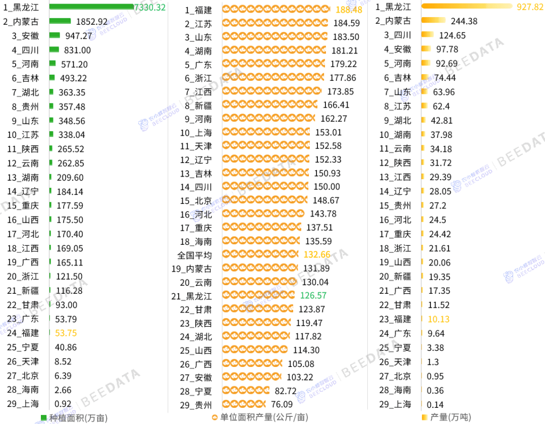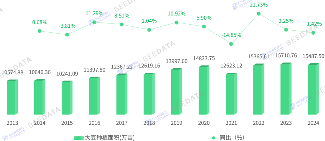 1。 据国度统计局数据显示,近年来,中国大豆种植面积、产量、单产程度均呈现波动增加态势。2024年,中国大豆种植面积达15487。5万亩(约合1。55亿亩),产量达到2065。24万吨,单元面积产量为133。35公斤/亩——取2013年比拟,近11年来,大豆种植面积增幅为46。46%,产量增幅为66。46%,单元面积产量增幅为13。66%。目前,大豆正在全国豆类种植面积取产量中所占的比沉别离高达87。34%、87。41%。2。 从区域结构来看,当前,中国大豆产区分布款式曾经根基确定,从大豆种植面积分布来看,东北地域占比50。96%,西部地域占比26。5%,中部地域占比15。51%,东部地域占比7。03%;从大豆产量分布来看,东北地域占比49。44%,西部地域占比25。82%,中部地域占比15。39%,东部地域占比9。36%;全国70%以上的大豆出产集中正在东北及西部地域。3。 从沉点产区来看,据国度统计局数据显示,全国31个省(自治区、曲辖市)中,除“青海、”外,其余29个省(自治区、曲辖市)均涉及大豆的规模化出产。连系中国各省大豆产量近5年集中度数据来看,80%以上的大豆产自“、、四川、安徽、河南、、山东、江苏、湖北、湖南”10个省——近5年大豆产量合计正在全国所占比沉不变正在84。5%以上;50%以上的大豆产自“、”2个省——近5年大豆产量合计正在全国所占比沉不变正在54%以上;产量规模稳居全国首位的“”产量正在全国所占比沉不变正在43%以上。大豆,做为主要的粮食做物和经济做物,正在保障国度粮食平安、推进农业增效和农人增收方面阐扬着至关主要的感化。近年来,跟着我国居平易近消费布局升级和畜牧业的快速成长,大豆需求量持续增加,供需矛盾日益凸起。为应对这一挑和,国度接踵出台了一系列政策办法,鞭策大豆财产复兴成长。中国大豆财产正在国度政策支撑和市场需求驱动下,种植面积稳步回升,产量持续增加,呈现出稳中向好的成长态势。2024年,我国大豆产量为2065。24万吨,但大豆进口量高达本本地货量的5。1倍,对外依存度高达83。57%——我国大量进口大豆取我国粮食布局的根基国情相关,取水稻、小麦、玉米三大从粮比拟,大豆亩产较低。按照国度统计局数据,2024年我国稻谷单产477公斤/亩、小麦单产396公斤/亩、玉米单产439。4公斤/亩,而大豆单产仅133。35公斤/亩。中国大豆出产结构呈现较着的区域集聚特征,次要集中正在东北春大豆区、黄淮海夏大豆区和南方多熟制大豆区。此中,东北地域(、、)做为保守劣势产区,凭仗其得天独厚的天然前提和规模化种植劣势,继续连结全国大豆出产的龙头地位。黄淮海地域(安徽、河南、山东、江苏)依托其优良的出产根本和市场需求,大豆种植面积和产量稳步增加。南方地域(四川、湖北、湖南)积极成长间做套种等高效种植模式,大豆出产连结不变。此外,西北地域(新疆、甘肃)和西南地域(云南、贵州)也正在积极摸索大豆种植新模式,成为我国大豆出产的新兴力量。2025年,是“十四五”规划的收官之年,也是我国大豆财产成长的环节节点。本文基于农小蜂正在运营过程中堆集的中国全国以及各省(自治区、曲辖市)、地级行政区(市)、县域的大豆种植面积、产量、单产等数据,对中国大豆财产成长示状、趋向及结构进行阐发,为处置大豆财产链上下逛科研、育种、种植、加工、仓储、包拆、保鲜、运输、发卖等勾当的从体及社会办事机构供给度的数据支持取计谋参考。2022年,国度提出鼎力实施大豆和油料产能提拔工程,正在东北地域开展粮豆轮做,正在黄淮海、西北、西南地域推广玉米大豆带状复合种植,国内大豆实现种植面积和产量的“双增”。据国度统计局数据显示,2024年,中国豆类种植面积为17733万亩(约合1。77亿亩)、产量为2362。64万吨,此中,大豆种植面积为15487。5万亩(约合1。55亿亩)、产量为2065。24万吨——正在全国豆类种植面积取产量中所占的比沉别离高达87。34%、87。41%。