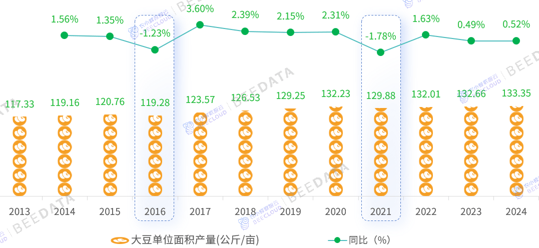 据国度统计局数据显示,2013年以来,中国大豆单元面积产量除了正在2016年和2021年受农业财产布局调整和手艺等分析要素影响,有过小幅下降外,其他年份均呈同比增加趋向。2013~2024年间,中国大豆单元面积产量从117。33公斤/亩波动增加到133。35公斤/亩,近11年间增加了16。02公斤/亩,增幅约13。66%,年均复合增加率约1。17%。