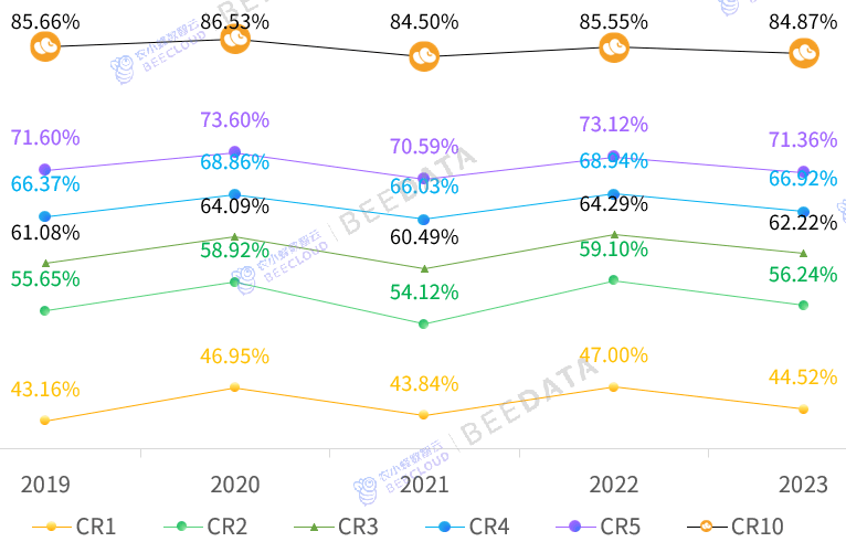 分析来看,2019~2023年,中国各省大豆产量CR5、CR10波动下降,CR1、CR2、CR3、CR4小幅添加,此中CR1增加最为较着——意味着中国大豆出产仍然呈现集中态势,并且这种集中正在“”产区的态势有更进一步集中的趋向。2023年,“、、安徽、四川、河南、、湖北、贵州、山东、江苏”10个省域大豆种植面积顺次位列全国前1~10位,面积规模均正在330万亩以上——合计达13433。3万亩(约合1。34亿亩)、约占全国大豆种植面积的85。5%;“、、四川、安徽、河南、、山东、江苏、湖北、湖南”10个省域大豆产量顺次位列全国前1~10位,产量规模均正在35万吨以上——合计达1768。91万吨、约占全国大豆产量的84。87%。此中,“江苏”大豆种植面积虽然位列全国第10位,但其单产程度较高,位列全国第2位、产量位列全国第8位;“贵州”大豆种植面积虽然位列全国第8位,但其单产程度较低,位列全国第29位、产量位列全国第15位;“湖南”大豆种植面积虽然位列全国第13位,但其单产程度相对较高,位列全国第4位、产量位列全国第10位;“、、安徽、四川、河南、、湖北、山东”8个省域的大豆种植面积和产量均同时位列全国前10名——2023年,这8个省域的大豆种植面积取产量规模合计别离为12737。8万亩(约合1。27亿亩)、1668。53万吨——别离占全国的81。08%、80。06%。