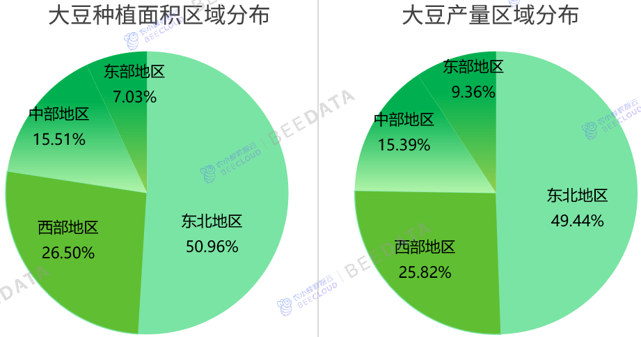当前,中国大豆产区分布款式曾经根基确定,2023年,从大豆种植面积分布来看,东北地域占比50。96%,西部地域占比26。5%,中部地域占比15。51%,东部地域占比7。03%;从大豆产量分布来看,东北地域占比49。44%,西部地域占比25。82%,中部地域占比15。39%,东部地域占比9。36%;全国70%以上的大豆出产集中正在东北及西部地域。