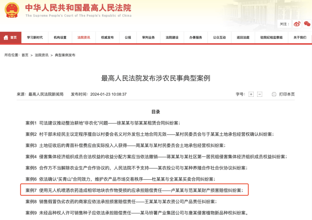 日前,余姚法院审结一路因飞防功课不妥惹起的侵权义务胶葛案件,判决被告上海某农业科技公司补偿受损农户共计58。9近几年无人机飞防正在大田做物和经济类做物上的使用越来越普遍,这给农业成长带来了良多便当,也帮种植户省去了良多人工成本,飞防变乱也屡见不鲜,特别是药害事务。当科技前进误伤,我们该若何对待,又该若何看待?如何才能避免“误伤”?上海某农业科技公司的承包田取黄某、杨某、程某三人的地盘相邻。该公司正在其承包田区域内利用无人机喷洒除草剂。不久后,黄某等三人发觉自家取该公司相邻地块的部门水稻秧苗呈现叶片正常、发黄枯死环境。同年11月,余姚市农业农村局做出农业出产变乱初步查询拜访演讲,此中载明“制种水稻发生除草剂药害取农用无人机喷洒的除草剂发生漂移存正在联系关系性”。之后,黄某等三人别离向余姚法院告状,要求上海某农业科技公司补偿减产丧失费、解救丧失费共计58。9万余元。法院审理后认为,按照本地农业农村局出具的农业出产变乱初步查询拜访演讲,能够认定被告的丧失取农用无人机喷洒农药具相关系,故法院鉴定,案涉变乱所形成的丧失应由被告承担,最终判决被告补偿三被告财富丧失共计58。9万余元。盐城东台市是出名的“桑蚕之乡”,该市头灶镇30多位蚕农半辈子种桑树,正在2022年和2023年的秋天了突如其来的窘境。桑树附近的农田利用无人机喷洒农药后,飘散的农药导致桑叶被污染,秋蚕食用桑叶后多量中毒灭亡,这让蚕农练炳义等人不已。王某某正在其承包的黄豆地块上养殖豆丹,邻地乔某某种植水稻。2023年9月,乔某某利用无人机对其承包的水稻田进行飞防功课。不久王某某发觉其养殖的豆丹呈现灭亡,揣度系因乔某某喷洒农药形成的,要求其补偿丧失25万余元。案件审理过程中,被告王某某申请司法判定。判定看法为豆丹灭亡取喷洒农药之间具相关系,豆丹丧失为10余万元。2024年7月,正在“荷藕之乡”扬州市宝应县,因无人机喷洒的农药残留随风向飘进藕塘,藕农万先生承包的480亩藕塘中荷叶呈现枯黄卷边,莲藕较着减产。颠末初步排查,藕塘南面相邻有1300多亩水稻田,属于广洋湖镇辖区内,可能是6月下旬利用无人机喷洒农药功课时,部门残留物跟着风向飘进了藕塘中。无独有偶,统一期间,安徽池州市水稻种植大户鲍某利用无人机对自家承包的近300亩稻田喷洒除草剂,却未料当日的西南风将部门药雾吹向邻间高某家的藕塘。以致高某家本来碧绿的荷叶呈现一些卷边、发黄以至焦枯现象,新抽的藕带表皮也浮现一些褐色黑点。经其自行向某判定机构申请判定,高某认定其莲藕丧失系无人机所喷洒的农药飘移所致,遂将鲍某诉至乌沙法庭要求补偿。有着不异的还有无锡宜兴市的农户周先生,他种植的800棵绿化苗木蒙受邻田无人机喷洒农药误伤,丧失过半。本年1月,最高向社会发布了九起涉农人事典型案例,此中就包含一路利用无人机喷洒农药形成相邻地块农做物受损的案例。频频协调、农户间对簿公堂,不只耗损了大量的时间精神,也使得部门地域对无人机功课避而远之。